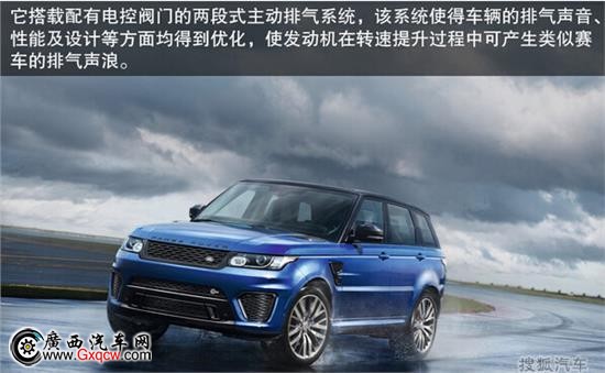 作為高性能車型,駕駛氛圍同樣重要,攬勝運(yùn)動(dòng)版SVR擁有更具視覺沖擊力的外觀,而定制化的跑車座椅也令其獨(dú)樹一幟。它搭載配有電控閥門的兩段式主動(dòng)排氣系統(tǒng),該系統(tǒng)使得車 輛的排氣聲音、性能及設(shè)計(jì)等方面均得到優(yōu)化,使發(fā)動(dòng)機(jī)在轉(zhuǎn)速提升過程中可產(chǎn)生類似賽車的排氣聲浪。