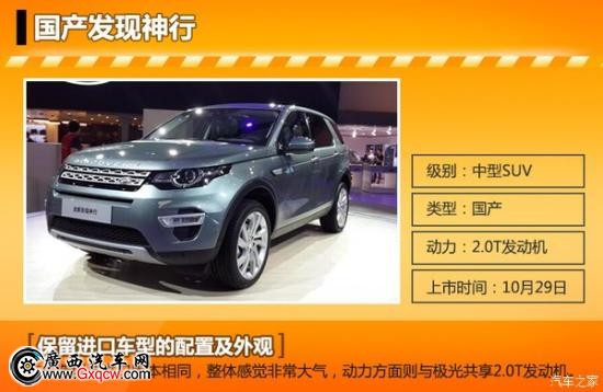 繼奇瑞捷豹路虎推出首款路虎 品牌國產(chǎn)車型攬勝極光后,在9月份成都車展上首次亮相的第二款國產(chǎn)車型發(fā)現(xiàn)神行得到了廣泛關(guān)注。國產(chǎn)發(fā)現(xiàn)神行在外觀造型上與進(jìn) 口版本保持一致,并搭載一臺(tái)2.0T渦輪增壓發(fā)動(dòng)機(jī)。今日,網(wǎng)通社從奇瑞捷豹路虎汽車官方獲悉:路虎第二款國產(chǎn)車型發(fā)現(xiàn)神行將于今日正式上市。該車是豪華 中型SUV細(xì)分領(lǐng)域中,首款采用7座布局的車型,新車預(yù)售價(jià)40萬元起,上市后將與極光形成全新的“組合拳”。