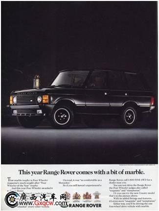 純黑背景下,只是新車與大理石獎杯(marble trophy)的簡單合影,氣場便已經(jīng)到位。這就是1989年新款攬勝上市時的廣告。想想那些時尚大片,只要一個型男不也就夠了嗎,攬勝亦同理。