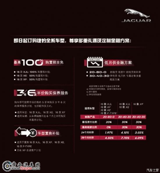 即日起至2016年3月31日(含),通過(guò)捷豹官方授權(quán)經(jīng)銷商訂購(gòu)2016款捷豹XE、捷豹XF、捷豹XJ、捷豹F-TYPE,即享20%超低首付,更將享受1.88%(24期)和2.88%(36期)的超低利率。