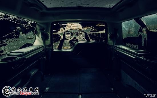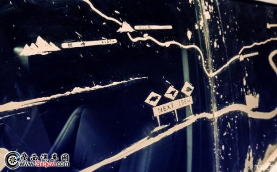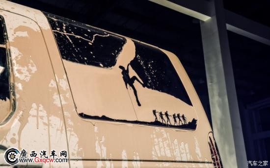 一 位攀登者的形象被繪于車身左側(cè)后舷窗,在他的身后已佇立著無數(shù)座高峰,而攀登者依舊繼續(xù)不斷向新的高度進(jìn)發(fā),象征著路虎第四代發(fā)現(xiàn)不斷超越自己,登頂座座 山峰的探險精神。畫面上還特別標(biāo)注了幾座對第四代發(fā)現(xiàn)而言有著特殊意義的山峰,如海拔4,100米的駝峰與4,023米的天山山脈,像一個個榮耀的勛章引 人去回顧曾經(jīng)的征途。而右面車窗上則如一張?zhí)诫U者手中的地圖,上面繪著巖石遍布的崎嶇之地,冰雪漫天的苦寒之所,黃沙漫漫的荒蕪沙漠和車轍遍布的泥澤地 帶。這些平時人跡罕至的地方,正是探險者的樂園,畫面上一串淺淺的腳印貫穿期間,象征第四代發(fā)現(xiàn)對這類艱苦地形的征服,他就像一個忠實的伙伴隨著勇者一路 前行。移步車的后方,后擋風(fēng)玻璃上,一位手持望遠(yuǎn)鏡的探險家正凝視前方,背對坦途,探索未知,他是發(fā)現(xiàn)精神的實體表現(xiàn)。正是這種精神,讓多少人堅定夢想, 不斷發(fā)現(xiàn),一往無前。