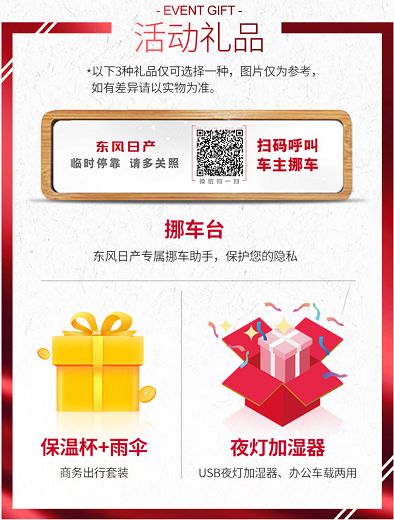 購首次到店客戶即可獲得東風(fēng)日產(chǎn)到店禮一份(原廠挪車臺;保溫杯+雨傘;辦公室車載兩用USB夜燈加濕器三選一)