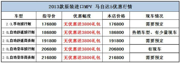2013款馬自達5上市時間3個月左右,售價方面較老款只有小幅度抬升。作為進口車型,馬自達5是國內比較熟悉的一款實用多功能MPV,日本原裝進口的過硬品質,打破傳統(tǒng)MPV車型的流線型設計,2.0L的強勁動力,和普通轎車相同的油耗,空間百變且用途多樣化的空間設計,加之20萬的價格,進口馬自達5絕對是您放心、滿意之選!