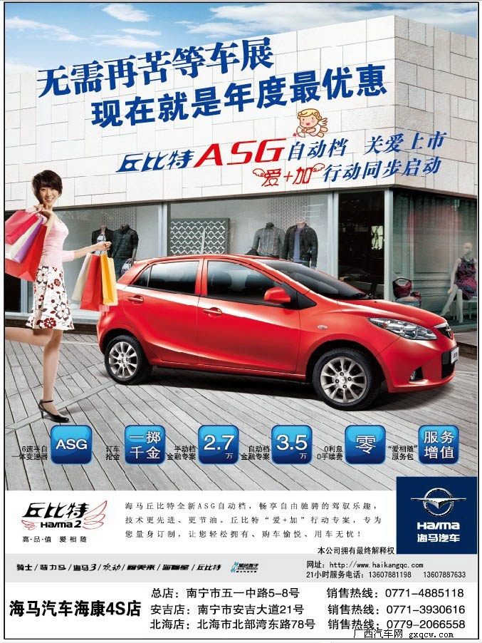 丘比特ASG自動(dòng)檔樣車已到南寧海康店,定價(jià)6.39-7.19萬(wàn)元。丘比特ASG是海馬汽車在“家轎進(jìn)化論”指導(dǎo)下而推出的A0級(jí)家轎*新力作。海馬汽車海康4S店副總經(jīng)理謝富寧表示,專為丘比特量身定做的營(yíng)銷產(chǎn)品――“愛(ài)+加”營(yíng)銷行動(dòng)也同步啟動(dòng),它通過(guò)整合運(yùn)用汽車金融平臺(tái)、售前和售后服務(wù)體系等營(yíng)銷資源,將丘比特的產(chǎn)品競(jìng)爭(zhēng)力和品牌含金量提升到了一個(gè)全新的水平。同時(shí)還推出了 丘比特“愛(ài)+加”營(yíng)銷行動(dòng), 主要有 “丘比特金融專屬服務(wù)(買半貸半零息零手續(xù)費(fèi))”、“一擲千金”訂車搶金活動(dòng)、“愛(ài)相隨”服務(wù)增值禮包等三項(xiàng)活動(dòng)。      現(xiàn)在還在等待車展的客戶,可以不再苦等了,?惮F(xiàn)在其它車型推出年度最惠價(jià),進(jìn)一步降低消費(fèi)者的購(gòu)車門檻和用車成本,能夠讓更多的年輕消費(fèi)者一圓轎車夢(mèng),提前享受汽車生活帶來(lái)的樂(lè)趣。